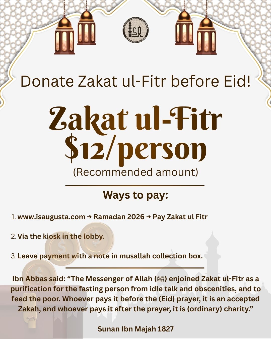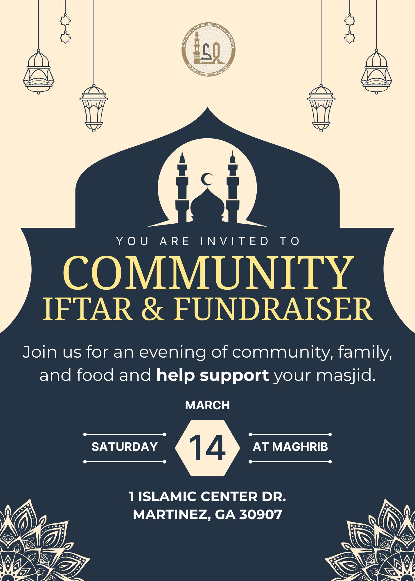 The Islamic Society of Augusta relies on your support! We ask for $240 per individual or $480 per family annually. This support helps facilitate programs and other ongoing costs of the center. Students (18-25 years old) are asked to donate a minimum of $60 annually.